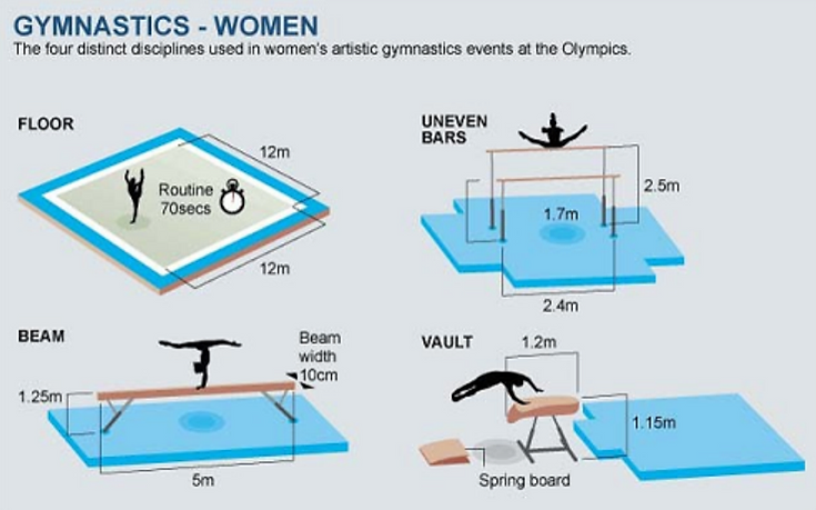 A creative combination of expressive dance, daring acrobatics and powerful gymnastics performed to music, where each gymnast communicates her own personality and style. The floor event occurs on a carpeted 12m × 12m (40′ × 40′) square, called a “spring floor.